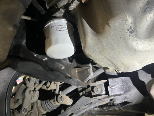 スズキジムニーのオイル/エレメント交換のご依頼で入庫しました。 定期的メンテナンスされているお車です。 まずは古いエンジンオイルを抜きます。 オイル抜け切ったので、エレメントも取外しました。 エンジン