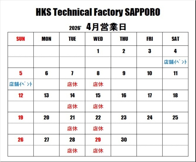 HKSテクニカルファクトリー札幌 4月営業日のご案内
