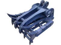 「レーキングラブ」は、強度・耐摩耗性に優れた本格レーキで原野や森林などでの不要な低木の除去、伐根、除草、集草、掘削、石の除去やふるい分け、油圧式フォークで集積・積み込みを1台で行うことができるレーキ兼用フォークです。