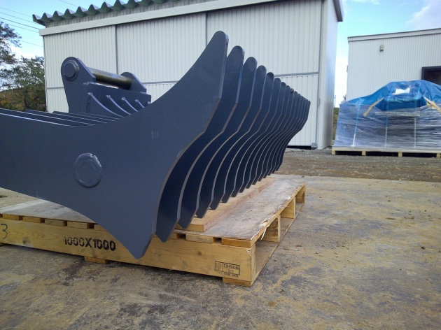 チルトローテーター(Steel Wrist製)に取り付ける開墾用レーキを納品