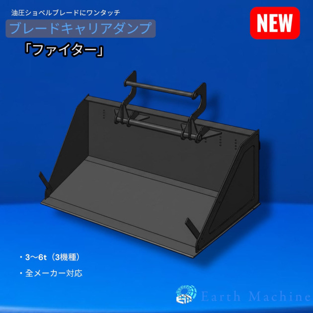 新商品 ブレードキャリアダンプ「ファイター」を追加 排土板(ブレード)にワンタッチで取り付けるキャリアダンプです。 〔使用用途〕 土砂の掘削、押土、敷き均し 土砂、砕石、廃材、資材等の小運搬 トラック