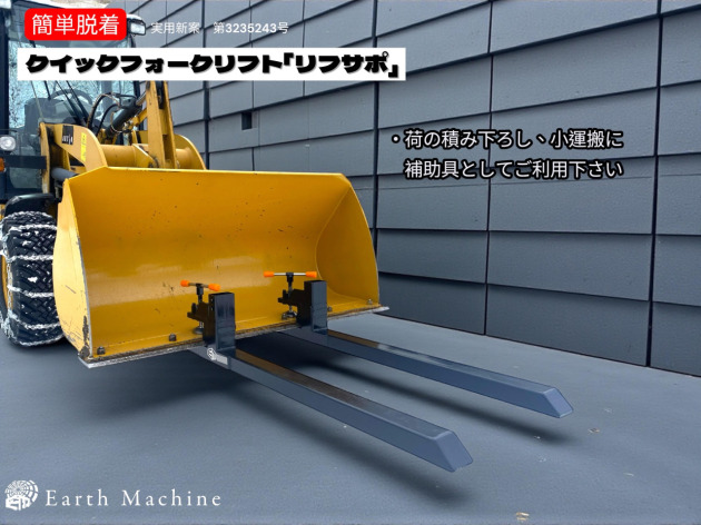 簡単脱着できる「リフサポ 」※実用新案登録済(第3235243号)は、導入されるお客様から『頻繁にリフト作業をする訳ではないのでホイールローダー(タイヤショベル)とトラクターで兼用できて満足している』と、ご好評頂いております。