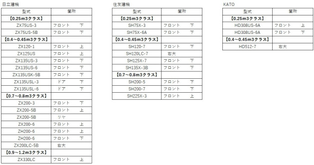 油圧ショベル用キャビンの社外ガラス対応機種(販売実績)一例
