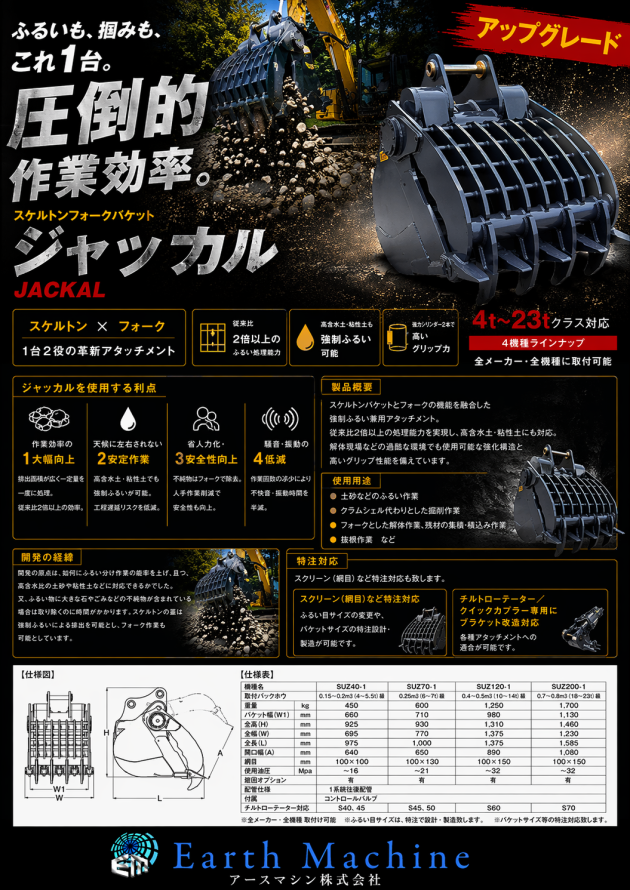 ジャッカルは、スケルトンバケットとフォークの機能を融合した
