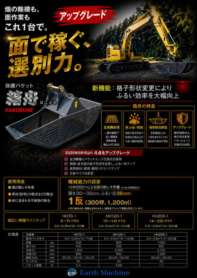 畑の除礫作業や骨材(砂利)の粉分除去を、より効率的に、より広範囲に。除礫バケット「箱舟」は、面作業に特化した高性能ふるい分けバケットです。