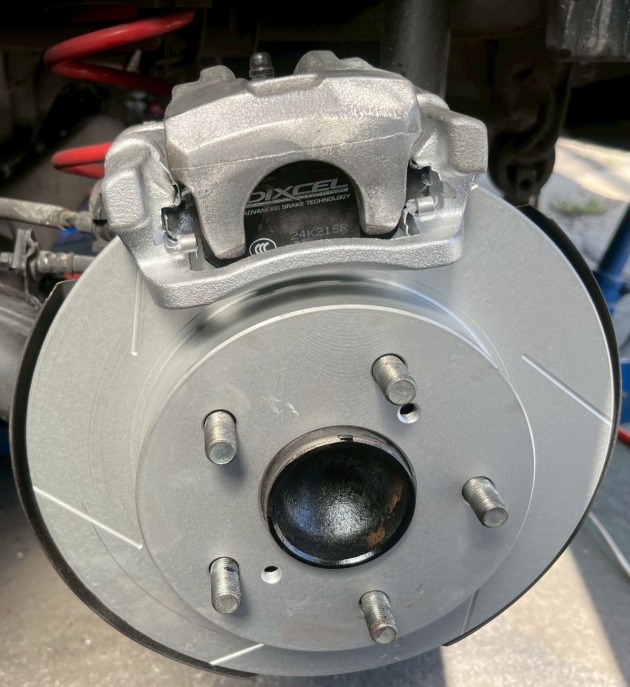 ディクセルのスリットローターとブレーキパッドを組み付けて元に戻し、作業完了です。
