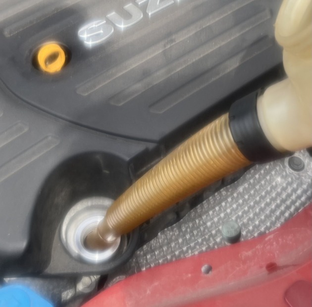 オイルフィルター持ち込みで32スイフトスポーツのエンジンオイル交換 2025年10月31日 スズキZC32Sスイフトスポーツのエンジンオイル/エレメント交換ご依頼を頂きました。先ずはエンジンオイルを抜いてエレメント(オイルフィルター)も外します。エンジンオイルは当店でご用意し、オイルフィルターは持ち込み品です。TMスクエアのオイルフィルターです。エンジンオイルを規定量入れます。エンジン始動後にレベルゲージを確認して作業完了です。この度はありがとうございました。