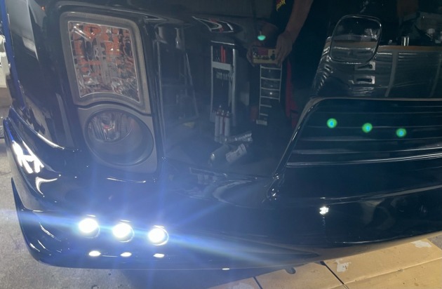 フロントスポイラーも同様に位置出しして、デイライトの配線を探して加工しました。