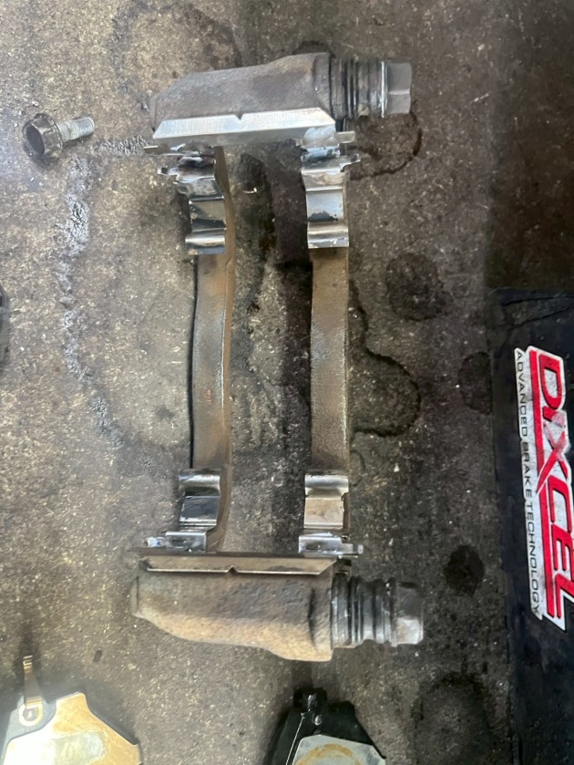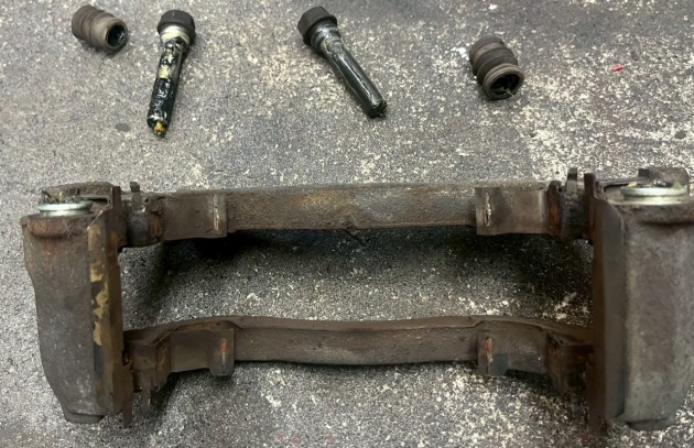 キャリパーを外してキャリパーサポートのスライドピンを確かめると・・・殆ど動きません。