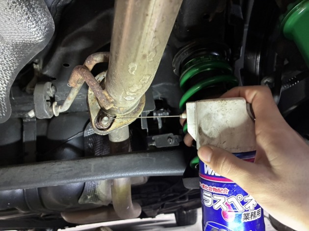 社外マフラーを取り外す為、ボルトナットにワコーズラスペネを吹き付けます。