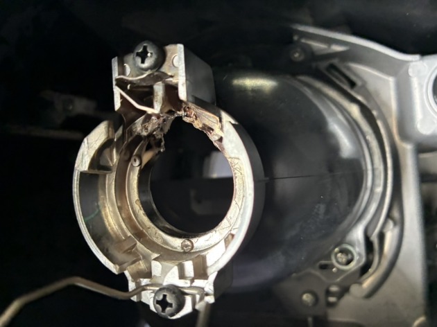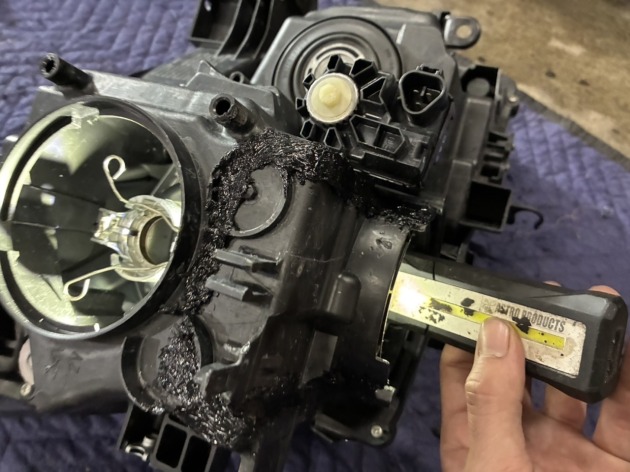 確認してみるとヘッドライト内のリフレクターが熱で溶けて