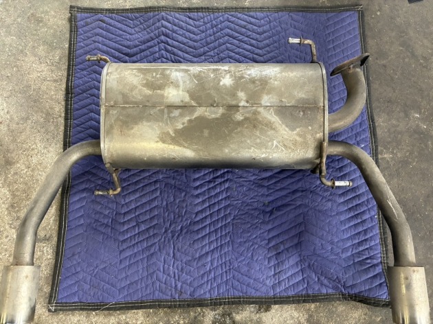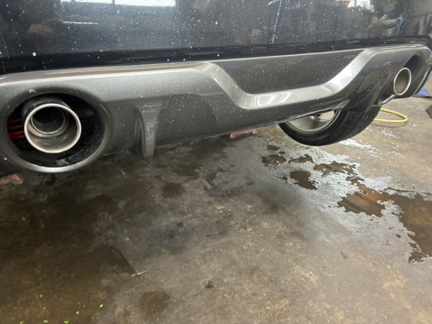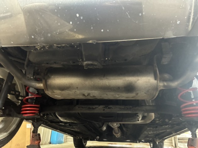 ご依頼者より『マフラーが社外品なので純正マフラーに交換して欲しい』と相談を受け、純正マフラーを持ち込んで頂いたので社外マフラーを取り外しました。
