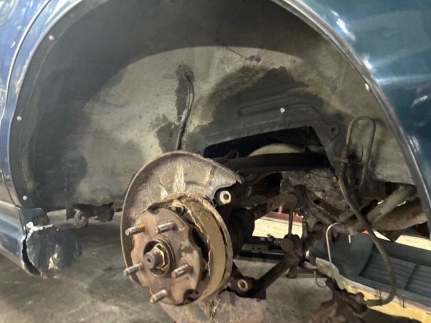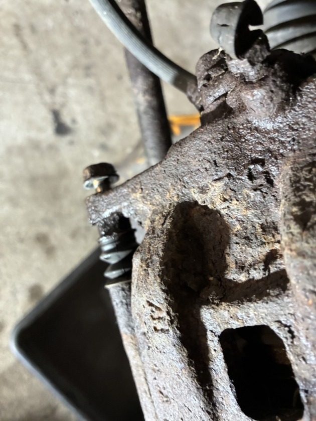アッパーアーム/ブレーキキャリパー、ディスク等々、サスペンションを外すにあたってパーツを取り外していきます。