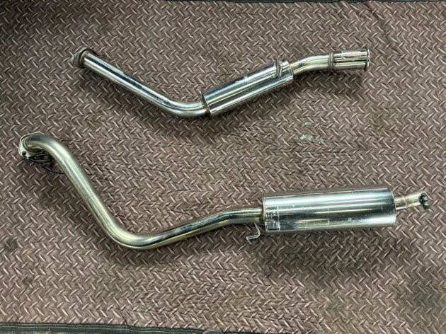 カット加工したフロントパイプの接続方法は、中間パイプに差し込んで金具で止める仕様となっていますので、先に中間パイプとリアピースを車両に取り付けます。