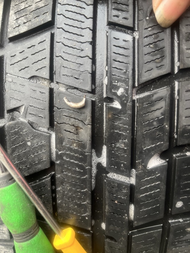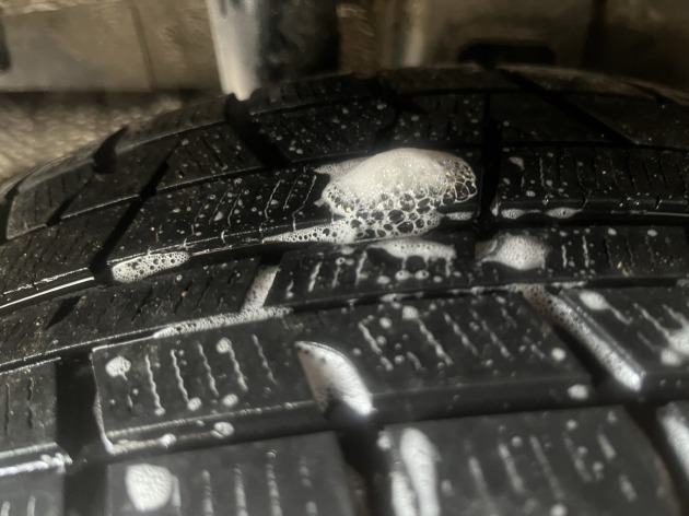 作業中、タイヤに違和感を感じたので・・・スプレーを噴射したところ、パンクしている事を発見しました。