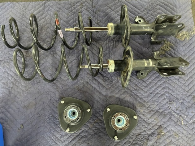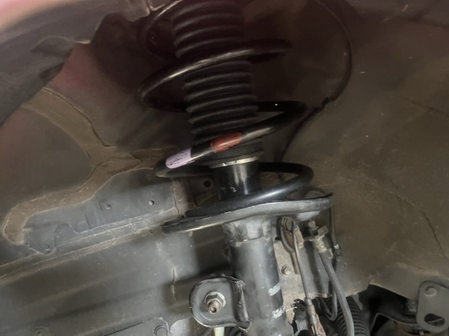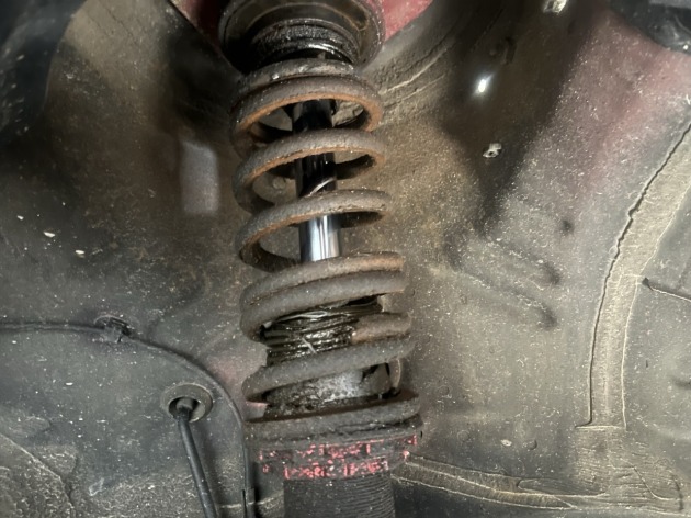 現状で、フロントサスペンションが「左右ともショックアブソーバからオイル漏れをしている」「右はバネ折れしている」状態です。