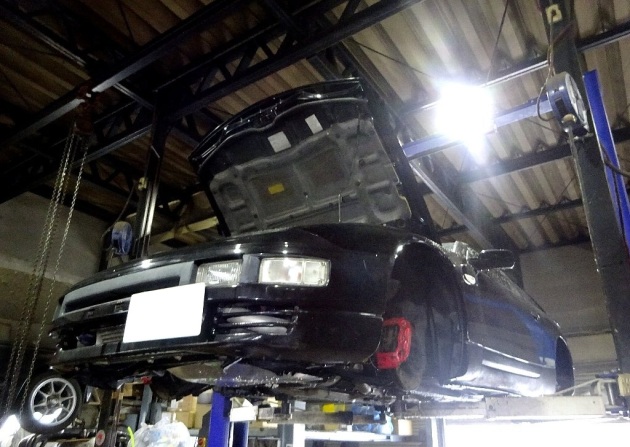 日産 フェアレディZ Z32 VG30 車検・整備 入庫しました (^_^) リフトに上げ 車券 整備へ フロントブレーキ 分解 点検 リヤブレーキ 分解 点検 R/デフ ロイヤルパープル 75W9