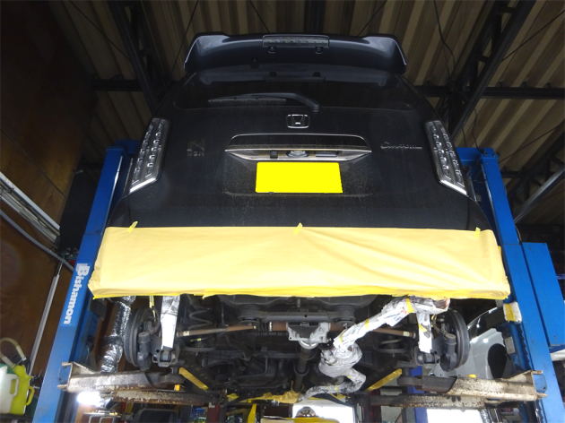 ホンダ N-WGN JH4 S07B ノックスドール 防錆施工 入庫しました (^_^) 下回り 洗浄後... マスキングを施し ノックスドール フル施工です (^▽^) ブレーキ ショック と.
