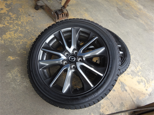 CX-3 DK5AW S5 タイヤ&ホイール装着です! 2025年9月14日 マツダ CX-3 DK5AW S5 入庫しました (*^_^*)納車された CX-3 が スタッドレスタイヤ しかないので...マツダ 純正ホイール(中古) と ダンロップ エナセーブ 215/50R18組込 バランス取装着しました (*^^)vPS 次は 下回り 防錆かなぁ ヽ(^o^)丿