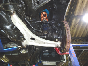 三菱 FTO DE3A 6A12 オイル洩れ修理&タイベル交換が終わり 待機してましたが... やっと FTO PITへ リフトに上げられました (^。^) エンジン 搭載が始まり... 載りました