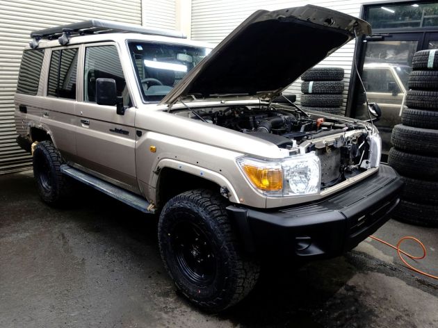 再販76製作中!!! 2025年11月26日 みなさまこんにちは!マークルです。本日は、先日買取させていただいたGRJ76の製作過程をご紹介します!!バンパー、グリル、リアラダーもブラックのチッピング塗装を施していきます!!再販76、乞うご期待!!
