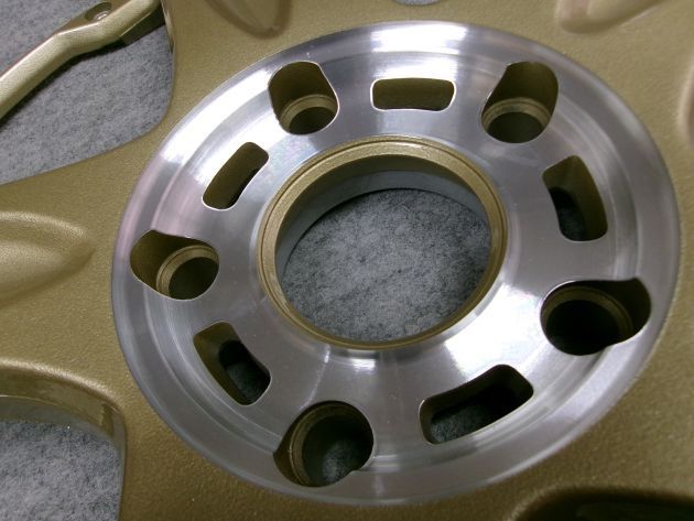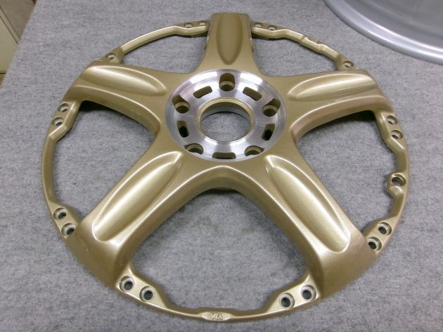焼き付けてゴールドを硬化させ、センターをダイヤカットにしてからディスク丸ごとクリアーをパウダーコート、もう一度焼き付けてディスク完了です。