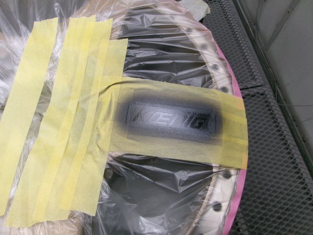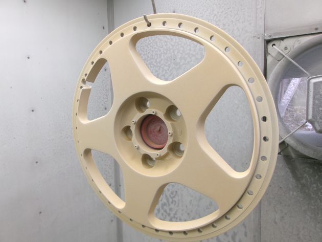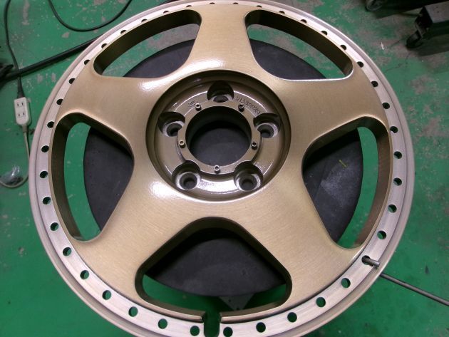 この時の塗装は、最後はパウダーコートのクリアーで閉じるので、通常のウレタン塗装で行うと、パウダーコートの焼き温度180℃には耐えられませんので、耐熱性のある塗装で行います。