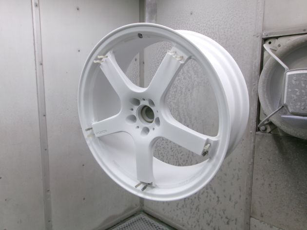 あまりに綺麗な鏡面になっているので、クリアーを塗装するのが勿体ない感もありますが、今回はクリアー塗装有りでご希望ですので、クリアーをパウダーコートします。