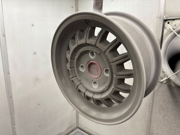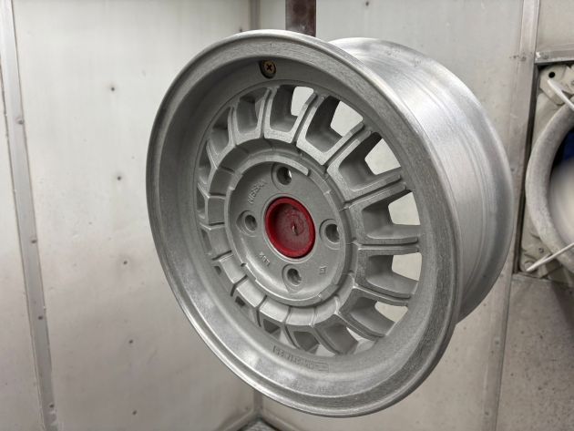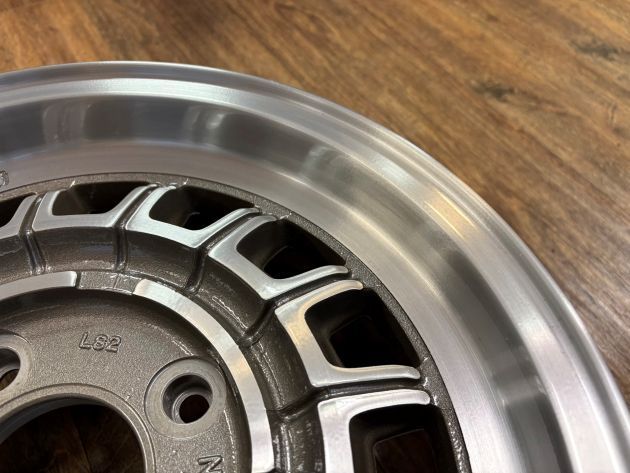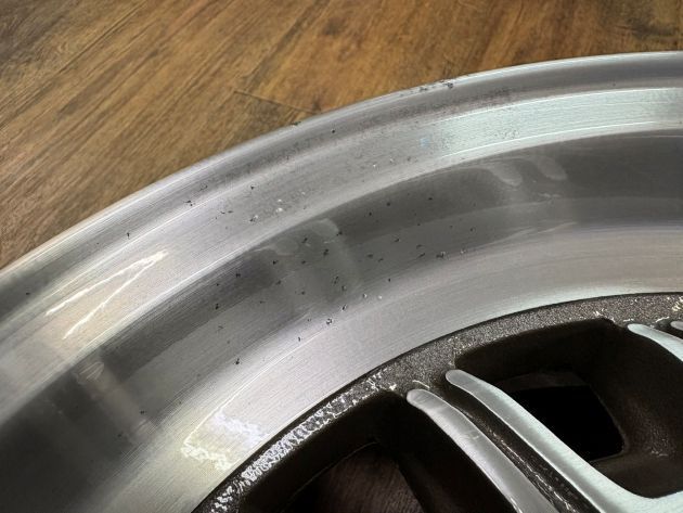 製造時は旋盤切削のダイヤカットですが、50年以上経ったこの時代の鋳造ホイールをダイヤカット切削すると、間違いなく巣穴だらけになり、クリアー塗装出来ない状態になるのが目に見えるので、ブラッシュドの要領で目を出来るだけ細かくして切削ふうにします。