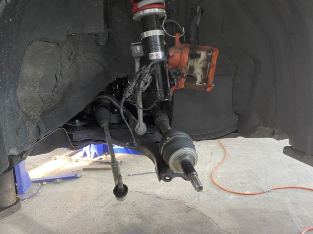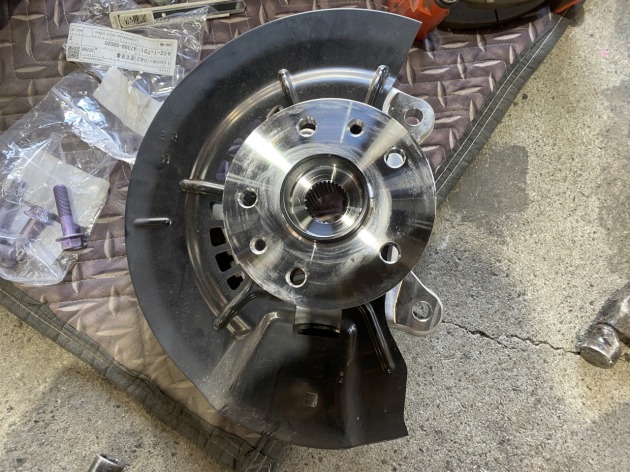 作業にはフロント足回りを分解し、新品ハブナックルにバックプレートとハブベアリングを移植しました。