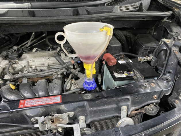 サーモスタット交換後にラジエターアッパーホースを取り付け、クーラントのエア抜きをしました。