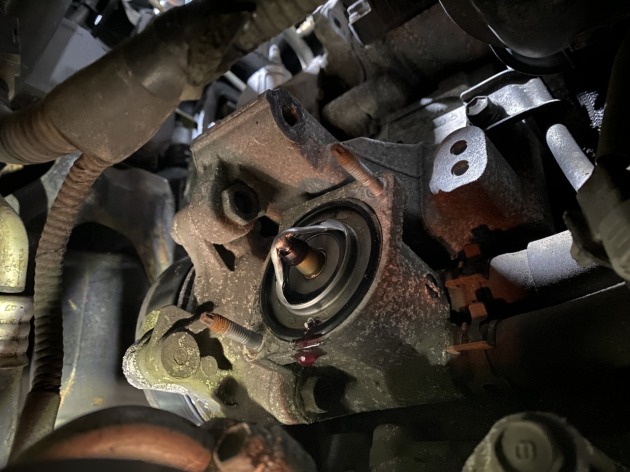 ウォーターポンプ故障の場合クーラントが滲んで故障のサインを出すので、今後はサーモスタットを交換します。