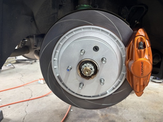 ディスクローターを取り付け、カスタムペイントしたキャリパーを装着しました。