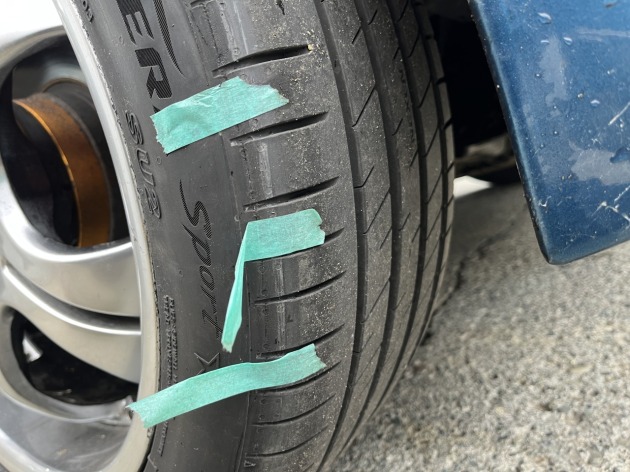 そして加工作業後にリアタイヤにチェック用テープを貼って走行点検し、キズついたりめくれたりしなければ干渉してないという結果が出るか?を確認します。