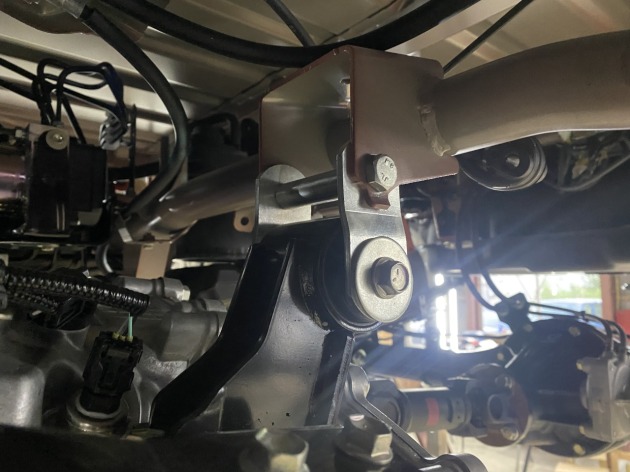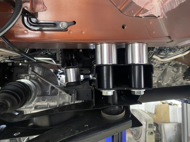 リフトアップに伴い、プロペラシャフト等に負荷が掛からないようにフロントメンバー・ミッションマウント・リアデフステーは付属品を使用して取り付け位置を下げます。