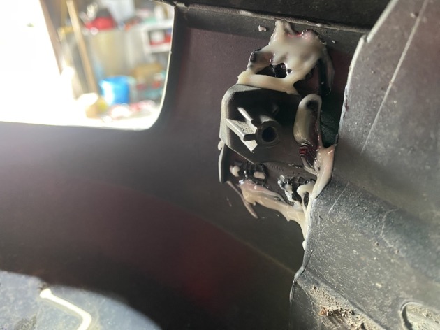 確認すると、バックフォグの取付ベース自体は無事ですが、リアバンパー側の差し込み部が割れていました。