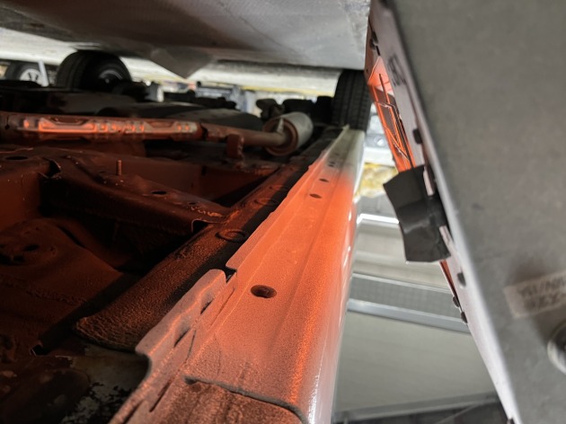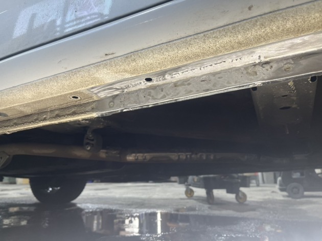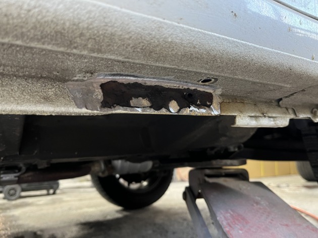 なぜか?右側の「サイドシルの耳」に錆でグサグサになっている所があり、『タイヤ交換をする時に気になっていて、だんだん酷くなってきたので修理しようかな...』という事で修理ご相談をいただきました。