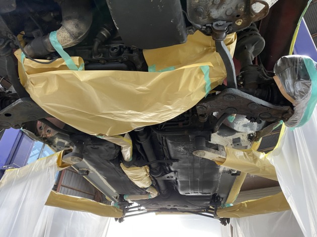 リフトに上げて、まずはマフラーや足回り等のアンダーコートを付着させたくない部分をマスキングします。