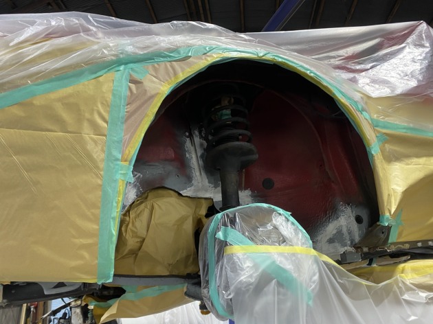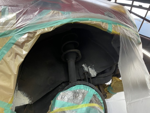 トヨタヴェルファイア30系前期がアンダーコート施工のご依頼で入庫しました。 まずはリフトに上げアンダーカバーの取り外しやサビ落としをします。 サビ除去後にマスキングを施します。 そしてタイヤハウスや下