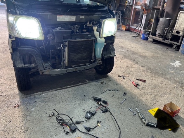 ハイゼットのHIDヘッドライトが片方切れた!修理の機会にLEDへ変更! 2025年11月30日 ダイハツハイゼットのヘッドライトが片方切れてしまったとの事で、バルブ交換修理ご依頼をいただきました。また、これまではHIDヘッドライトでしたので、この機会にLEDヘッドライトへ変更します。フロントバンパーを外さないとヘッドライト裏に手が回らないので、まずはフロントバンパーを外しますHIDの配線やバラスト等を取り外してから、LEDバルブに交換します。点灯確認した後にフロントバンパーを組み付けて、作業完了です。ご依頼ありがとうございました。
