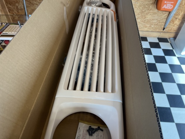 カスタムされた中古車を購入した当時から社外グリルが装着されていたそうですが、そのグリルはフィンが縦に構成されていて『このグリルだけ理想と違う』という事で、今回持ち込みいただいた横フィンタイプのKLC製グリルに付け替えされるそうです。