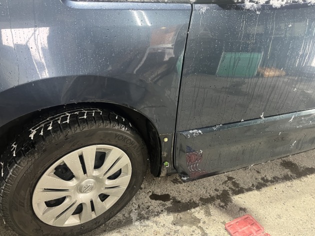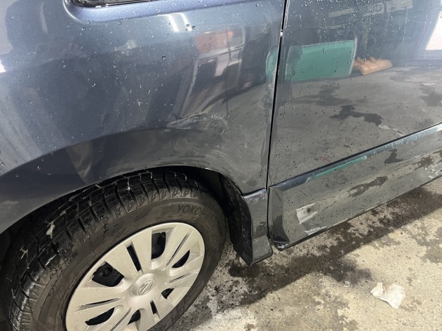 凍った路面でスリップし、左フロントフェンダーのタイヤ後方辺りが道路脇の雪山に接触し変形してしまったようで、タイヤ/ホイールは問題無いのですが、フロントドアが干渉して開かなくなっております。