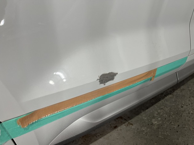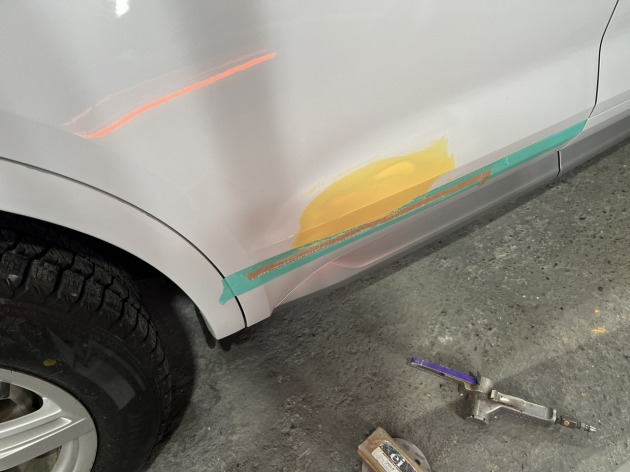 ドア下側のガーニッシュに損傷は無いので、ドア本体部分だけの板金塗装で済みそうです。