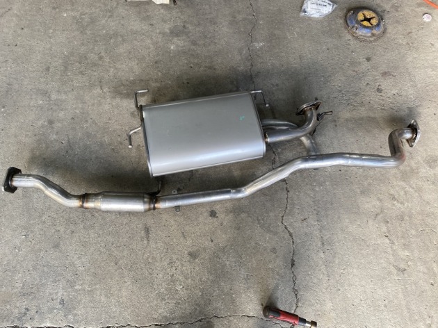 日産ラシーンの折れたマフラーの交換修理ご依頼をいただきました。 下回りを打ったようで、その衝撃でサビたフランジの溶接部分から折れていました。 新品マフラーを用意して交換します。 メーカーバックオーダー