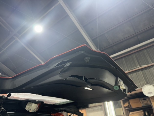 割れたガラスで傷がついているリアバンパーや室内トリムも交換ですね