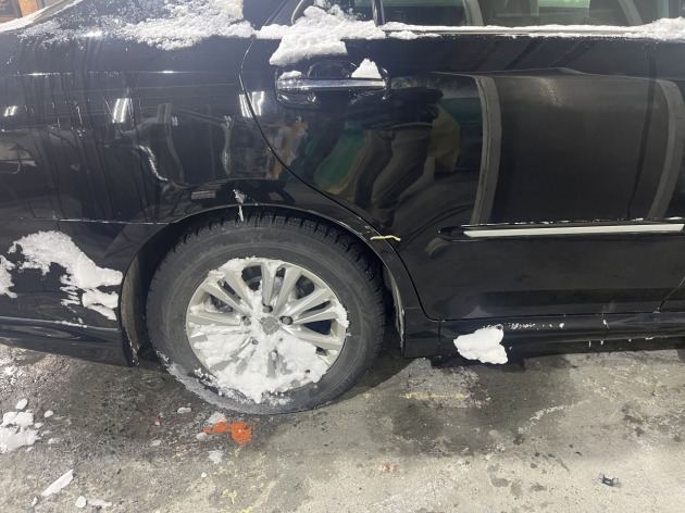 損傷箇所は右側面のリヤ側で、右リヤドアに傷が付いて、右リヤフェンダーが凹んでいます。