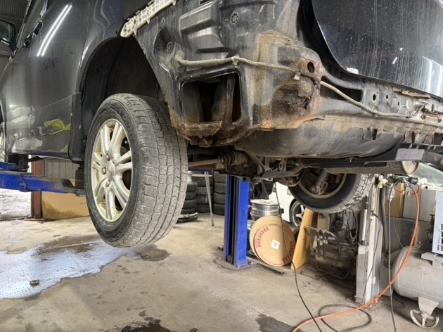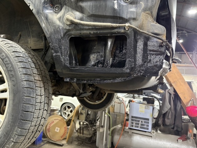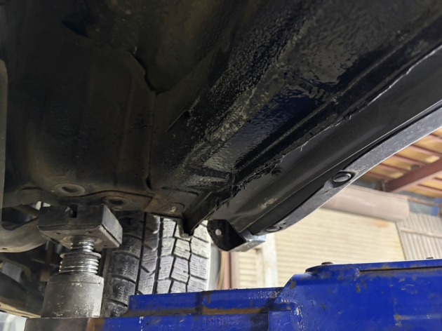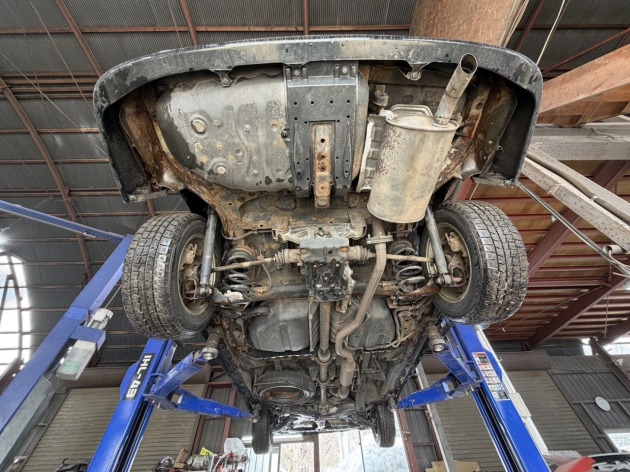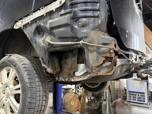 近隣の整備工場へ車検をご依頼されたところ『アンダーボディに穴が空いているので、このままでは車検に通らない』との指摘を受けられたそうです。また、その整備工場では板金修理に対応していないため『板金修理ができるところを探して依頼してください』と言われ、ネット検索で探して当店へお越しくださいました。