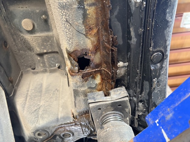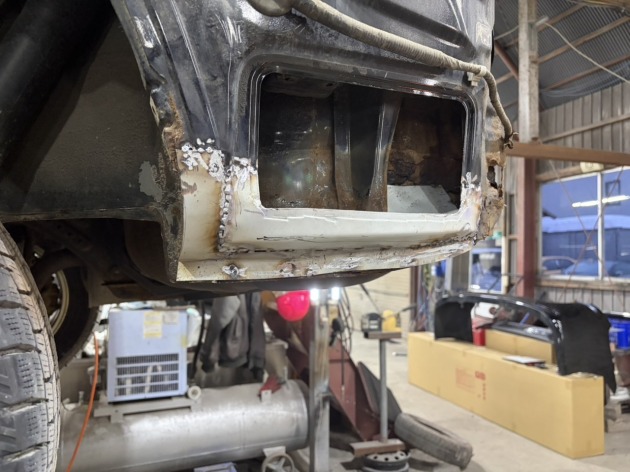 指摘箇所は左リアで、錆によって空いた穴が広がり鉄板が崩壊している状態でした。