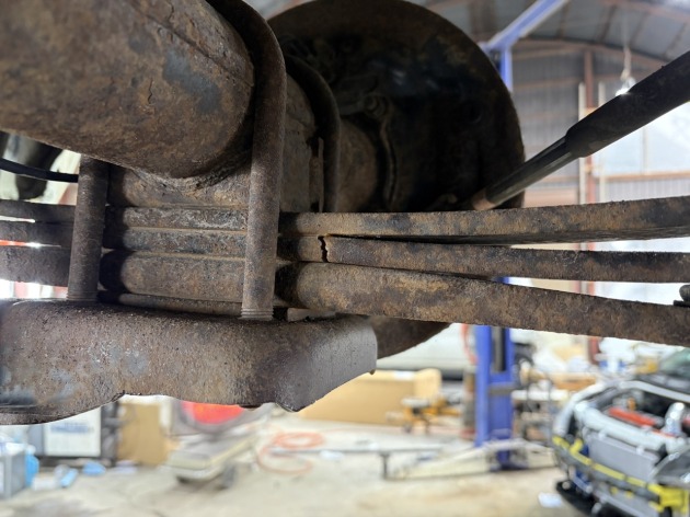 このままでは車検に通らないので、リーフスプリングを交換修理します。