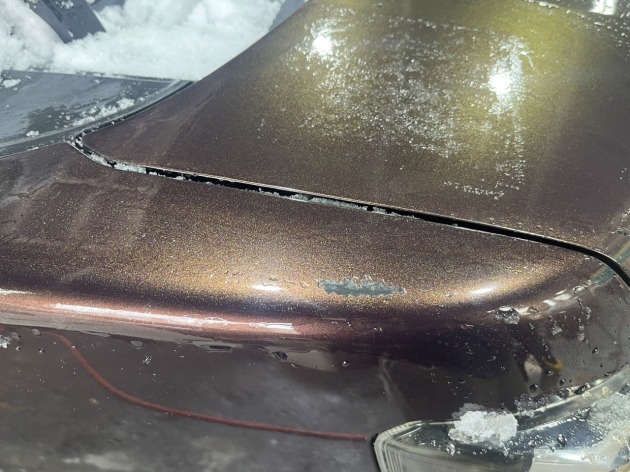 右フロントフェンダー上部は、えぐれ傷によって塗装が欠けています。